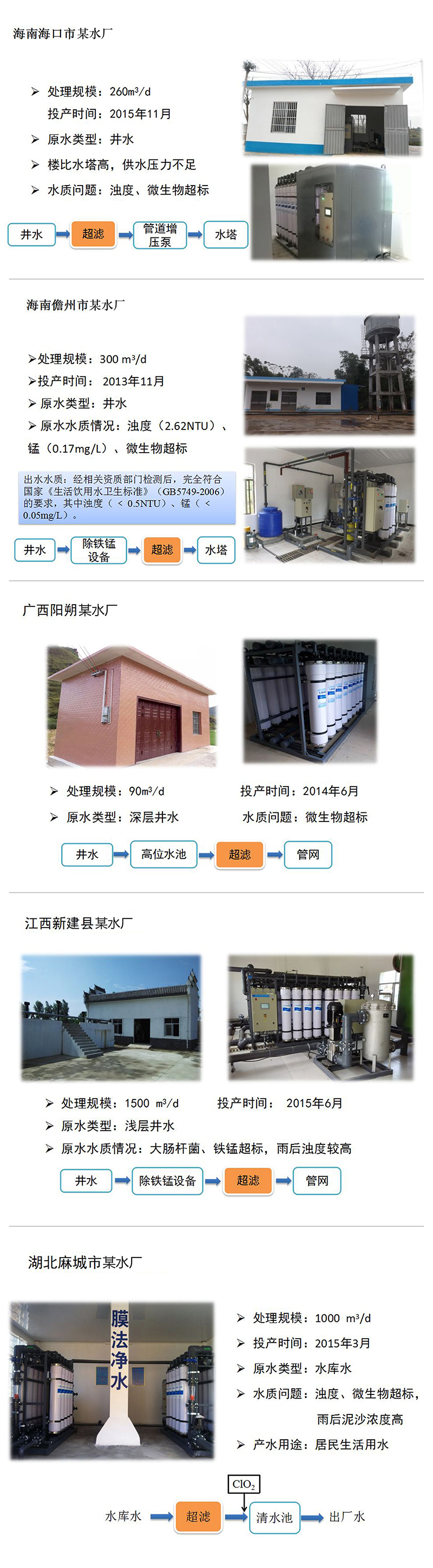 水源类型:地下水、河水、沟塘水、水库水、山泉水、雨水等。 水质问题:浊度、微生物、铁、锰、氟化物、有机物、硬度等。