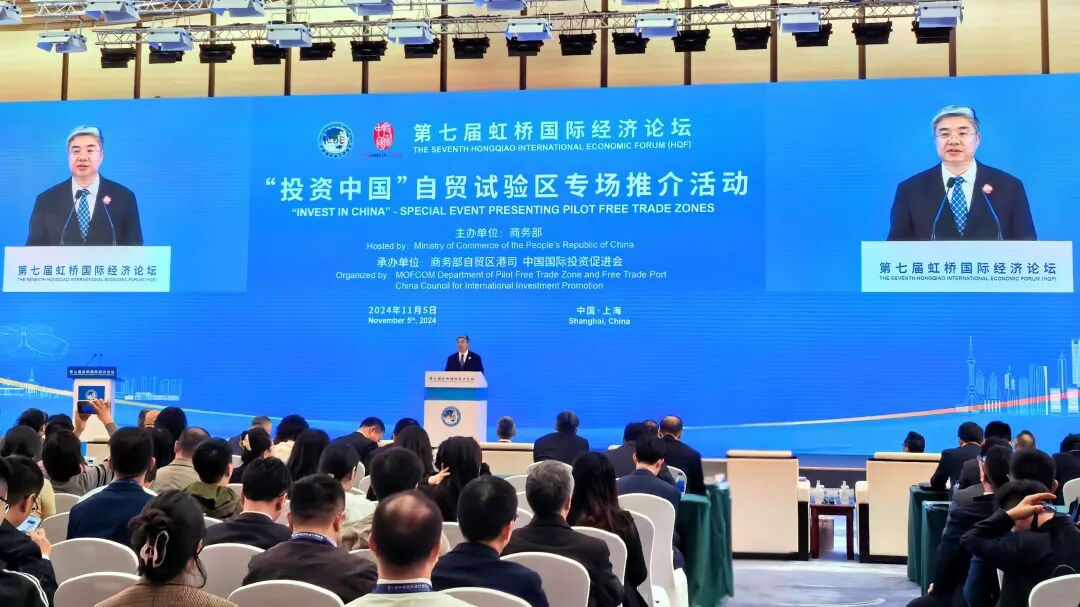 2024年11月5日下午,商务部在国家会展中心(上海)举办第七届虹桥国际经济论坛“投资中国”自贸试验区专场推介活动。商务部部长助理唐文弘、联合国工业发展组织总干事代表兼战略规划、方案和政策总司执行干事塞西莉亚·乌加兹·埃斯特拉达以及默沙东人类健康国际总裁罗万里出席并致辞,长江经济带沿线9个自贸试验区、国际组织、跨国公司和外国商协会等约350名代表参加活动。